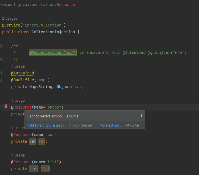 스프링 예제를 실행하려 하니 Cannot resolve symbol 'Resource' 요런 에러가 발생되었다.